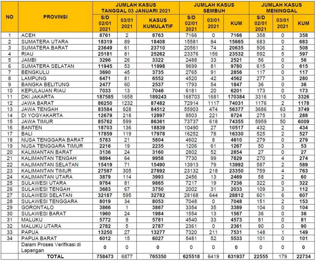 Barakata.id, Jakarta- Perkembangan kasus Coronavirus Disease (COVID-19), menggunakan sumber data WHO dan PHEOC Kemenkes tanggal 03 Januari 2021 seperti dikutip Barakata.id dari website covid-19, sebagai berikut;