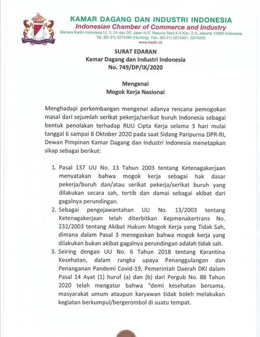 Surat Edaran Kadin terkait rencana mogok nasional yang akan dilakukan buruh. (F: CNBC Indonesia)Surat Edaran Kadin Indonesia terkait rencana mogok nasional yang akan dilakukan buruh. (F: CNBC Indonesia)Surat Edaran Kadin Indonesia terkait rencana mogok nasional yang akan dilakukan buruh. (F: CNBC Indonesia)